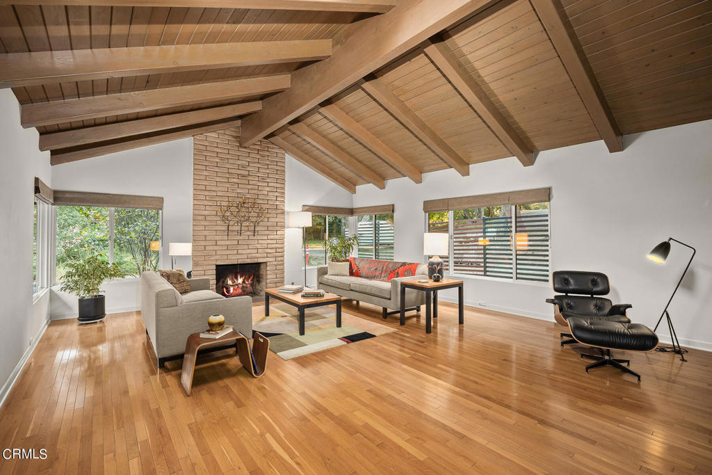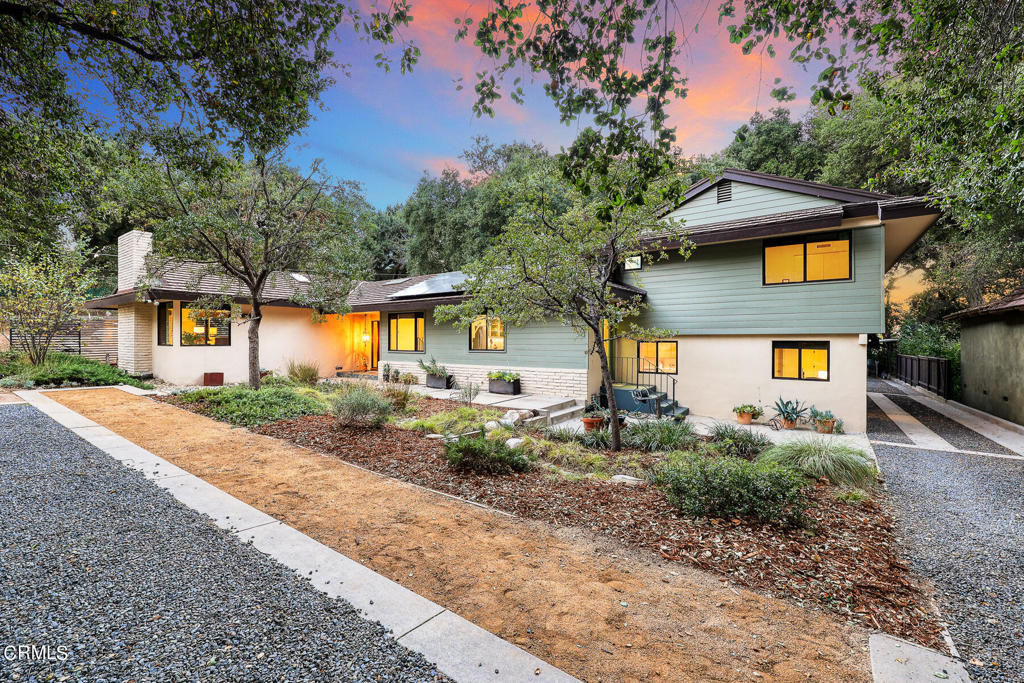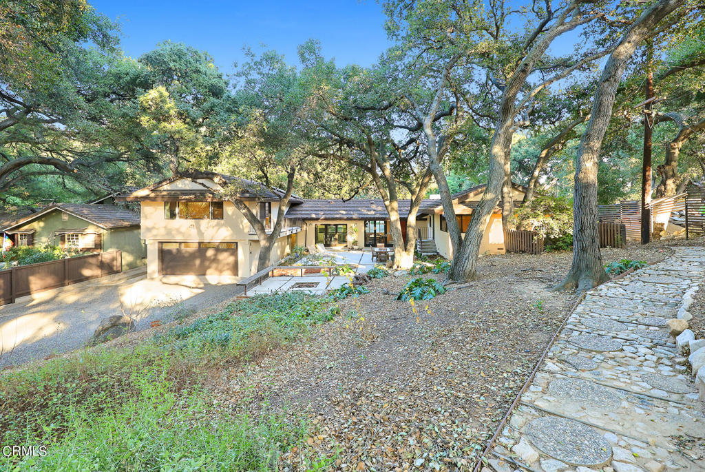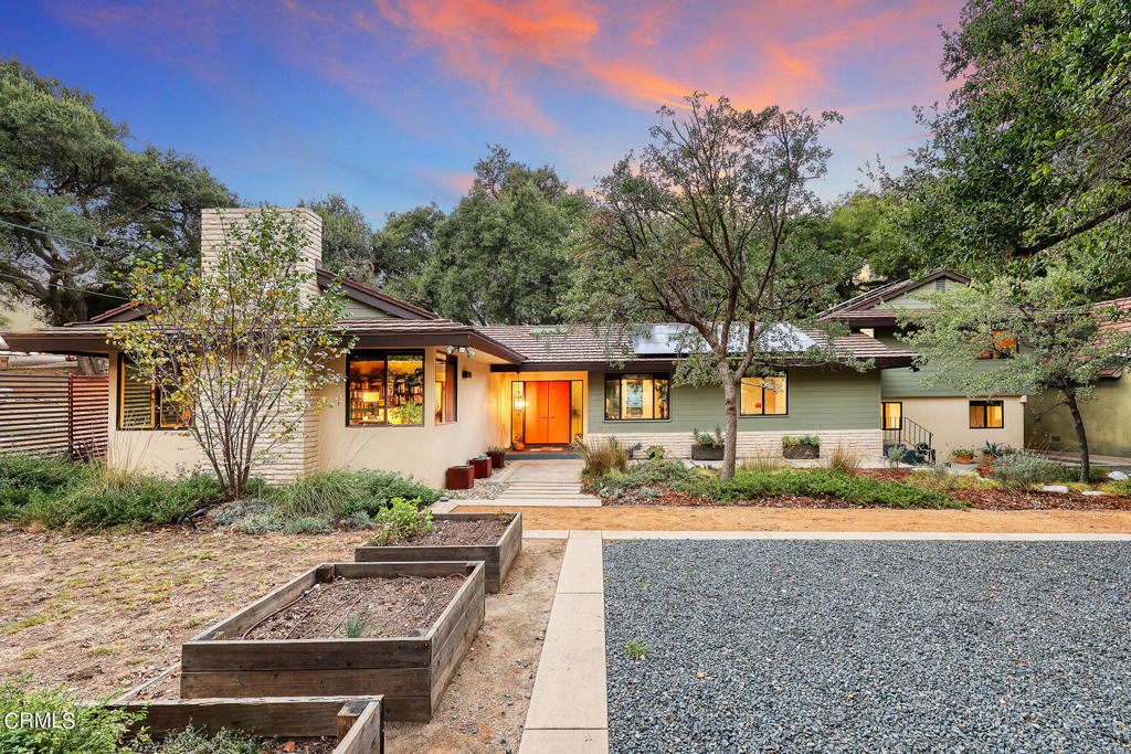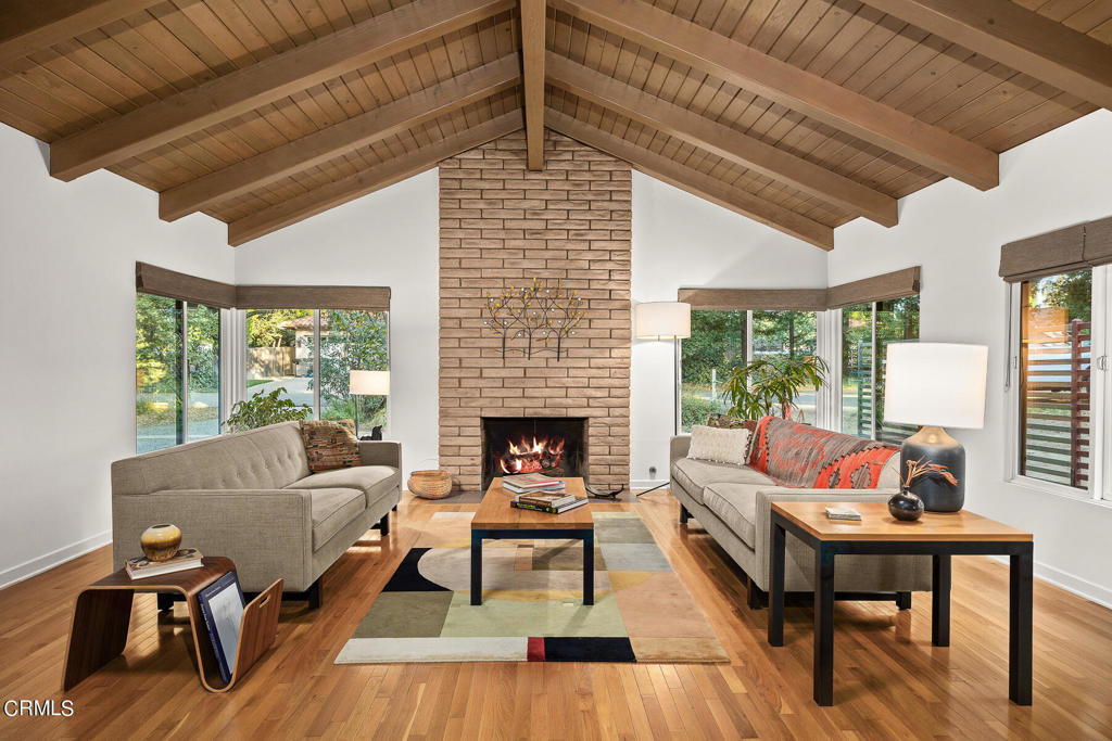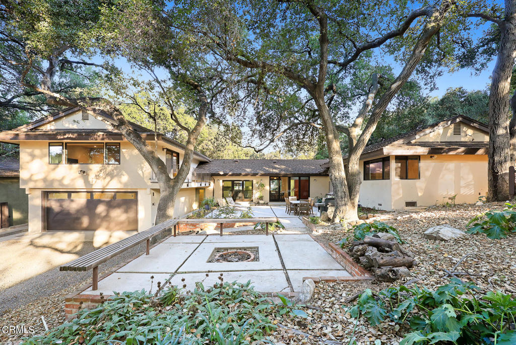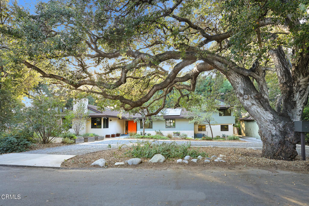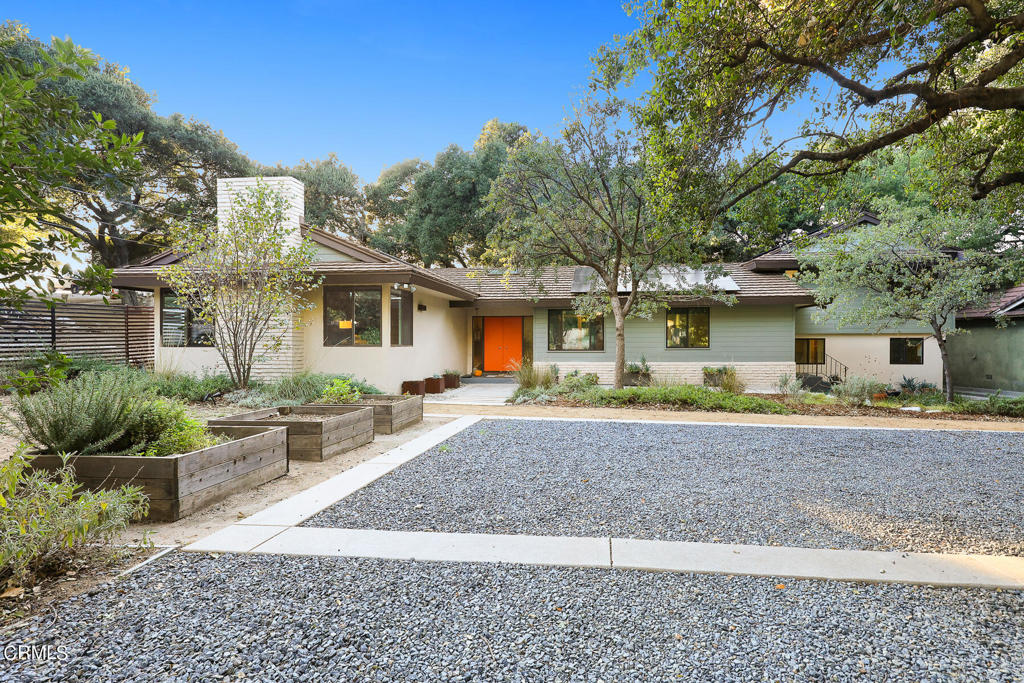 Nestled on a secluded private drive, this mid-century inspired home welcomes you to a blend of eco-conscious living and a peaceful and serene setting. Embrace a sustainable lifestyle as you make this fully electric home your own. Boasting an impressive 11.2-kilowatt solar panel system, an electric heat pump water heater, and a high-efficiency Trane heating and cooling system, this home not only reduces your carbon footprint but also offers significant financial savings. As you step inside, a spacious entry and dining combination welcome you with tile floors, a skylight that provides natural light, designer light fixtures, and sliding French doors with sweeping views of the backyard. The living room is a masterpiece of tranquility and features a cathedral ceiling with exposed wood beams, creating a sense of spaciousness. A floor-to-ceiling brick-faced fireplace faces abundant windows and a skylight, which shower the room with a soft, delicate glow. The primary bedroom suite boasts views of the backyard, patio, and lush greenery, inviting the beauty of the outdoors in. Recessed lighting, oversized closets with mirrored doors, and built-in shelves provide ample storage and convenience. The spacious bathroom features double sinks and abundant cabinetry for your daily needs. The junior bedroom suite is both spacious and stylish with an oversized closet and an adjoining full bath; it's the perfect retreat for family or guests. The heart of this home, the kitchen, offers a modern culinary experience featuring granite counters, an island with an induction cooktop, double ovens, a breakfast area, glass-faced cabinets, porcelain floor tiles, and ample storage that make it a chef's dream. The possibilities are endless with a multi-purpose room that includes a granite counter and sink, wine fridge, and direct access to the garage. Whether you need a home office, gym, or recreational room, this space adapts to your lifestyle. Additional features include a spacious den, two additional bedrooms with shared hall bath, an attached two-car garage with newly resurfaced epoxy floors and an EV charger, solid oak wood floors, and connection to the public sewer system (bond paid). The park-like setting offers an oasis of greenery, featuring a looping path shaded by multiple oak trees, a fire pit deck, and a courtyard accessible from most living spaces. It's a serene escape from the outside world, yet located minutes away from the YMCA, Town Center, and local freeways.
