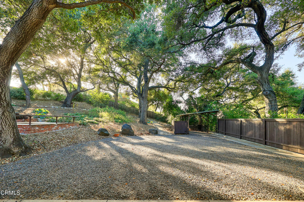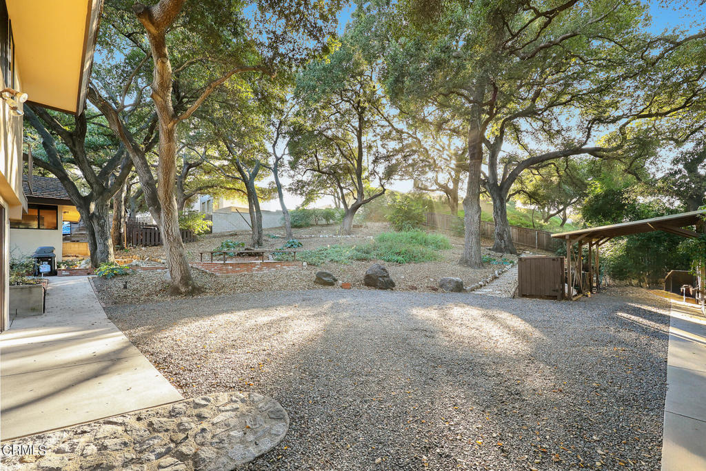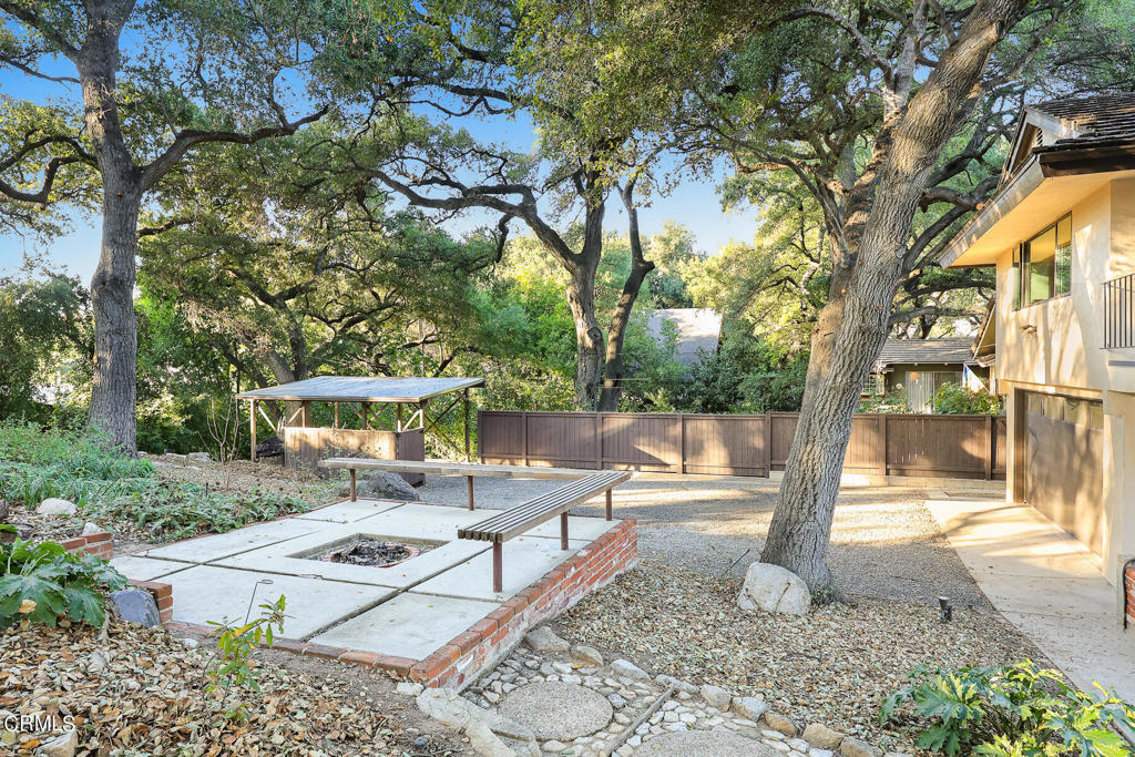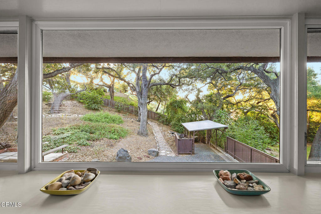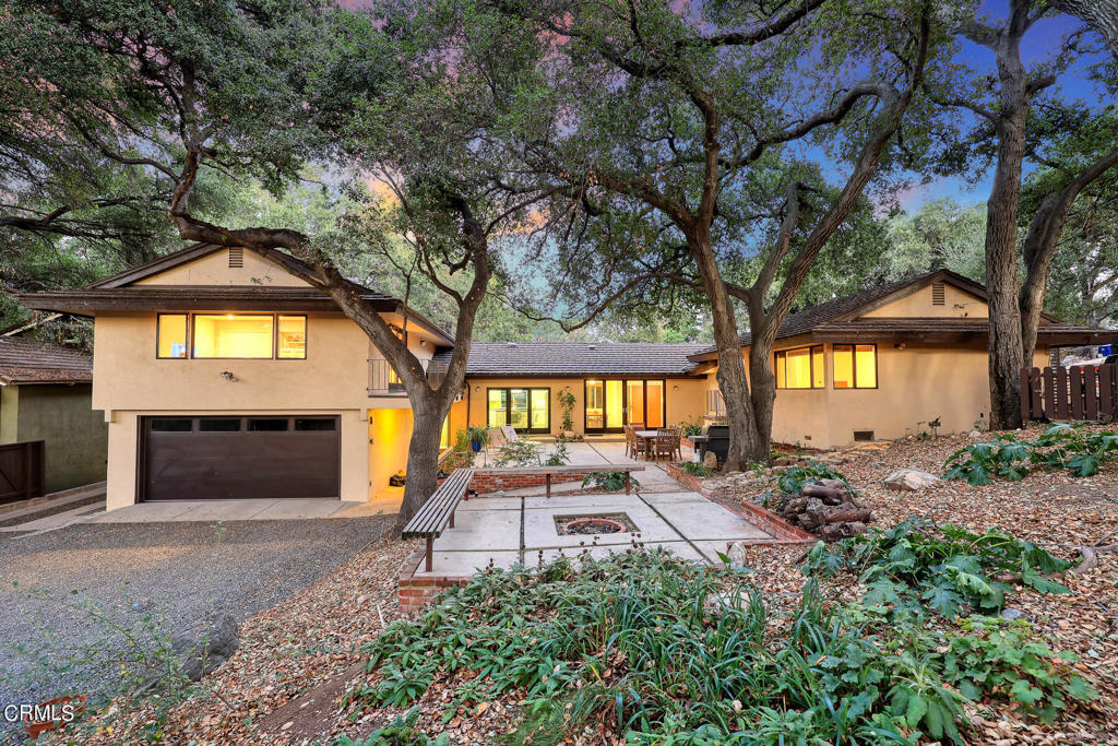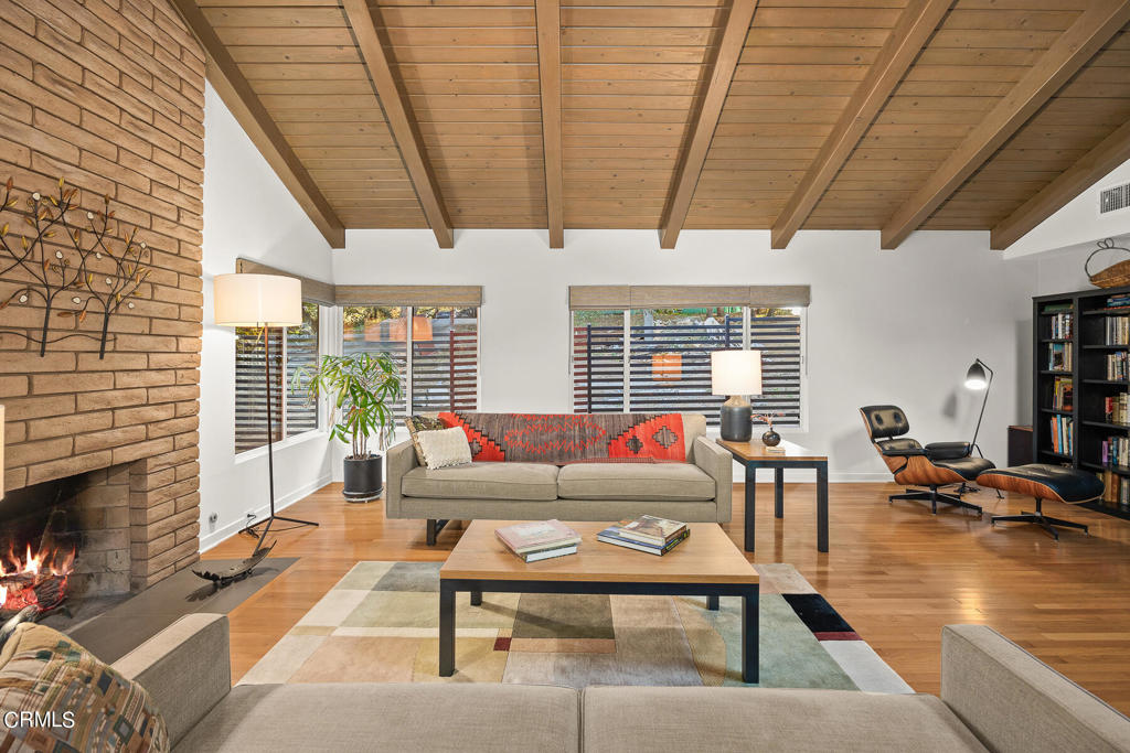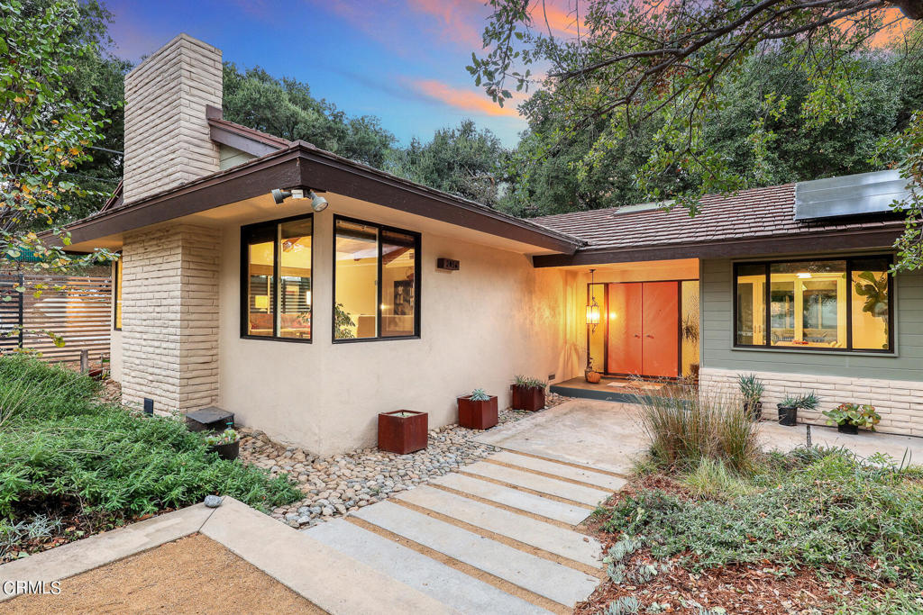 Nestled on a secluded private drive, this mid-century inspired home welcomes you to a blend of eco-conscious living and a peaceful and serene setting. Embrace a sustainable lifestyle as you make this fully electric home your own. Boasting an impressive 11.2-kilowatt solar panel system, an electric heat pump water heater, and a high-efficiency Trane heating and cooling system, this home not only reduces your carbon footprint but also offers significant financial savings. As you step inside, a spacious entry and dining combination welcome you with tile floors, a skylight that provides natural light, designer light fixtures, and sliding French doors with sweeping views of the backyard. The living room is a masterpiece of tranquility and features a cathedral ceiling with exposed wood beams, creating a sense of spaciousness. A floor-to-ceiling brick-faced fireplace faces abundant windows and a skylight, which shower the room with a soft, delicate glow. The primary bedroom suite boasts views of the backyard, patio, and lush greenery, inviting the beauty of the outdoors in. Recessed lighting, oversized closets with mirrored doors, and built-in shelves provide ample storage and convenience. The spacious bathroom features double sinks and abundant cabinetry for your daily needs. The junior bedroom suite is both spacious and stylish with an oversized closet and an adjoining full bath; it's the perfect retreat for family or guests. The heart of this home, the kitchen, offers a modern culinary experience featuring granite counters, an island with an induction cooktop, double ovens, a breakfast area, glass-faced cabinets, porcelain floor tiles, and ample storage that make it a chef's dream. The possibilities are endless with a multi-purpose room that includes a granite counter and sink, wine fridge, and direct access to the garage. Whether you need a home office, gym, or recreational room, this space adapts to your lifestyle. Additional features include a spacious den, two additional bedrooms with shared hall bath, an attached two-car garage with newly resurfaced epoxy floors and an EV charger, solid oak wood floors, and connection to the public sewer system (bond paid). The park-like setting offers an oasis of greenery, featuring a looping path shaded by multiple oak trees, a fire pit deck, and a courtyard accessible from most living spaces. It's a serene escape from the outside world, yet located minutes away from the YMCA, Town Center, and local freeways.