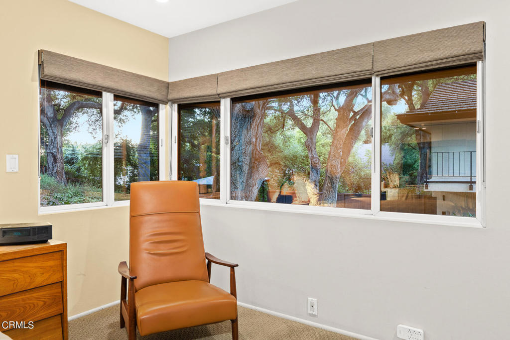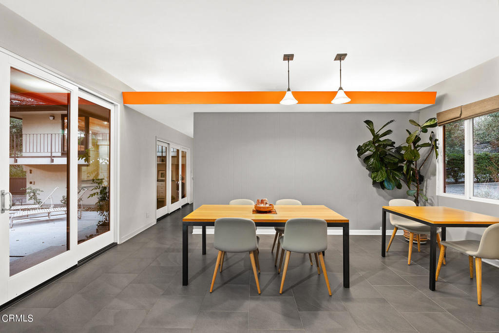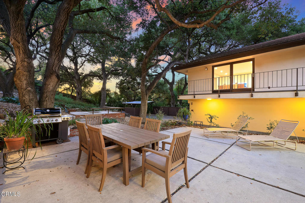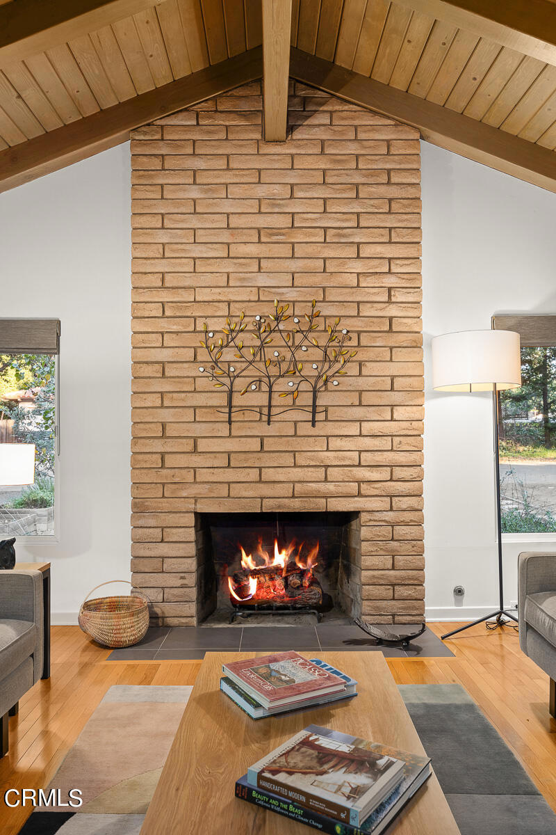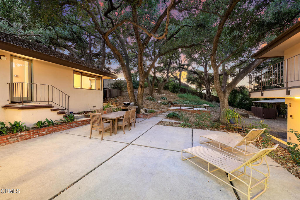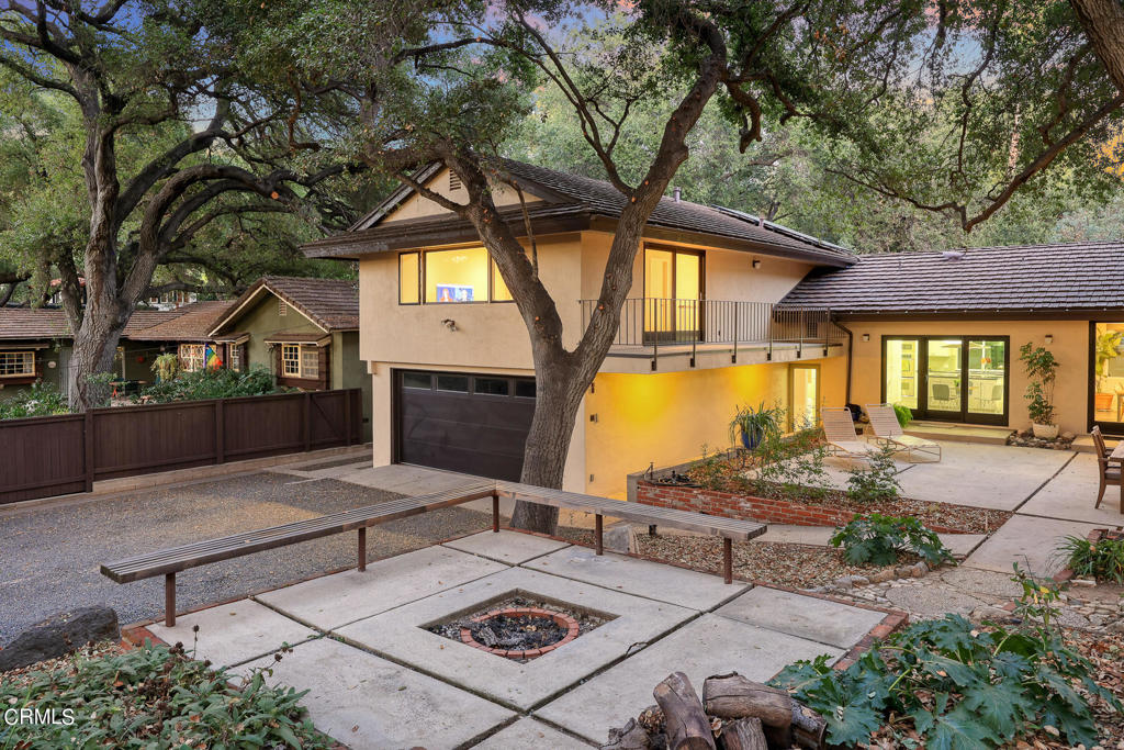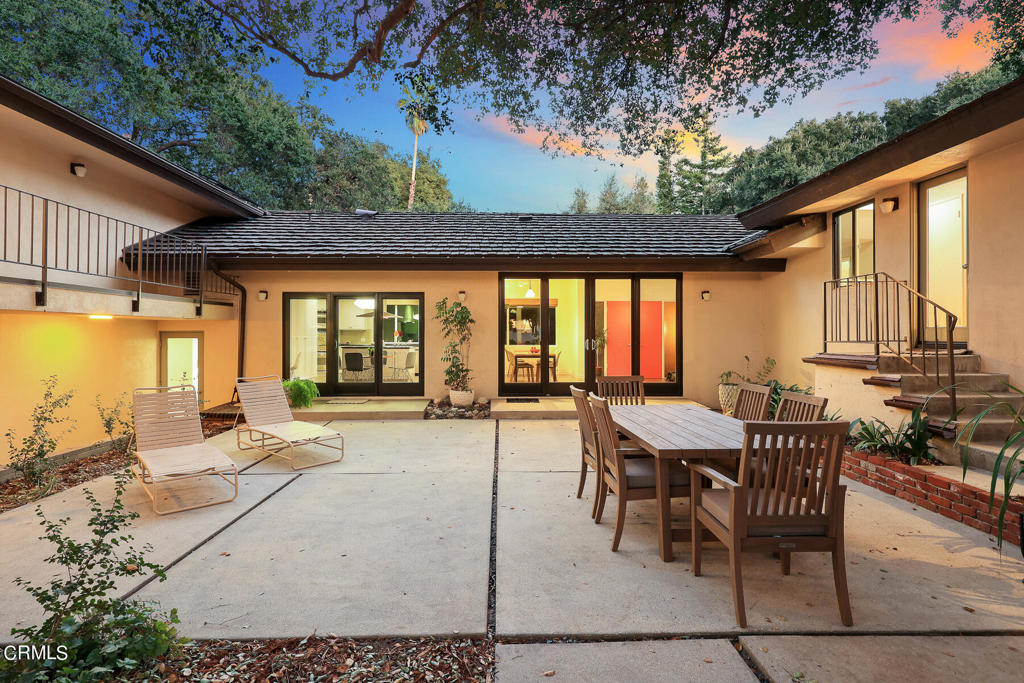 Nestled on a secluded private drive, this mid-century inspired home welcomes you to a blend of eco-conscious living and a peaceful and serene setting. Embrace a sustainable lifestyle as you make this fully electric home your own. Boasting an impressive 11.2-kilowatt solar panel system, an electric heat pump water heater, and a high-efficiency Trane heating and cooling system, this home not only reduces your carbon footprint but also offers significant financial savings. As you step inside, a spacious entry and dining combination welcome you with tile floors, a skylight that provides natural light, designer light fixtures, and sliding French doors with sweeping views of the backyard. The living room is a masterpiece of tranquility and features a cathedral ceiling with exposed wood beams, creating a sense of spaciousness. A floor-to-ceiling brick-faced fireplace faces abundant windows and a skylight, which shower the room with a soft, delicate glow. The primary bedroom suite boasts views of the backyard, patio, and lush greenery, inviting the beauty of the outdoors in. Recessed lighting, oversized closets with mirrored doors, and built-in shelves provide ample storage and convenience. The spacious bathroom features double sinks and abundant cabinetry for your daily needs. The junior bedroom suite is both spacious and stylish with an oversized closet and an adjoining full bath; it's the perfect retreat for family or guests. The heart of this home, the kitchen, offers a modern culinary experience featuring granite counters, an island with an induction cooktop, double ovens, a breakfast area, glass-faced cabinets, porcelain floor tiles, and ample storage that make it a chef's dream. The possibilities are endless with a multi-purpose room that includes a granite counter and sink, wine fridge, and direct access to the garage. Whether you need a home office, gym, or recreational room, this space adapts to your lifestyle. Additional features include a spacious den, two additional bedrooms with shared hall bath, an attached two-car garage with newly resurfaced epoxy floors and an EV charger, solid oak wood floors, and connection to the public sewer system (bond paid). The park-like setting offers an oasis of greenery, featuring a looping path shaded by multiple oak trees, a fire pit deck, and a courtyard accessible from most living spaces. It's a serene escape from the outside world, yet located minutes away from the YMCA, Town Center, and local freeways.