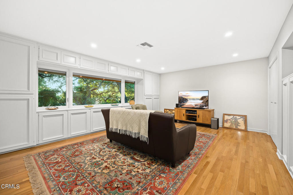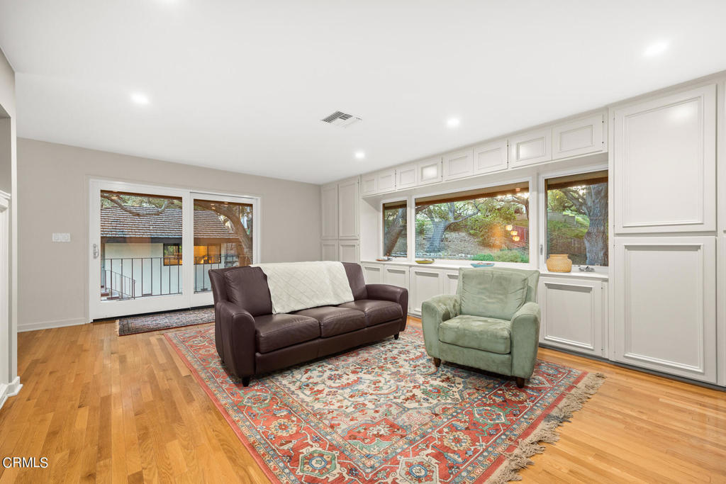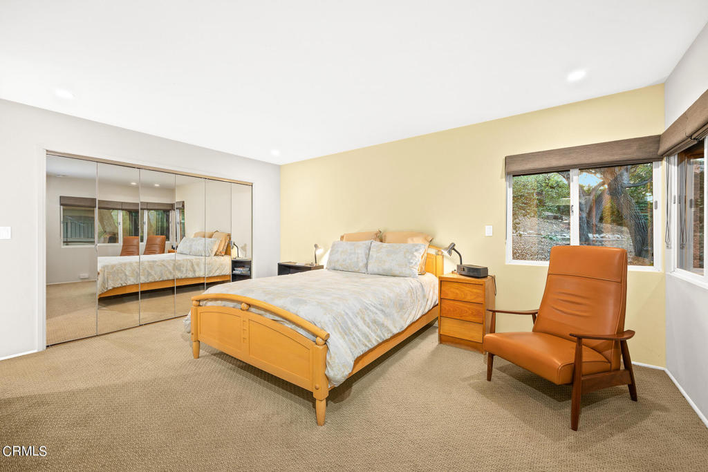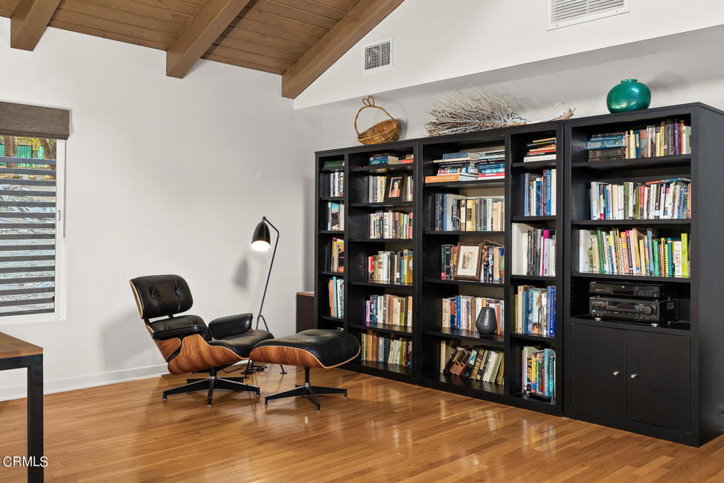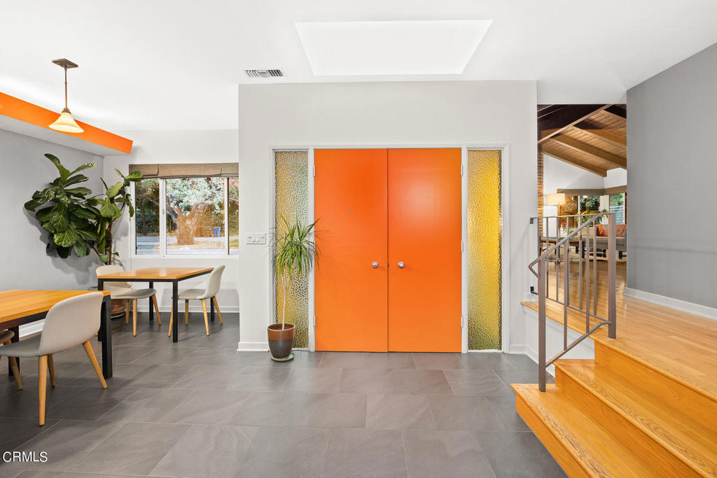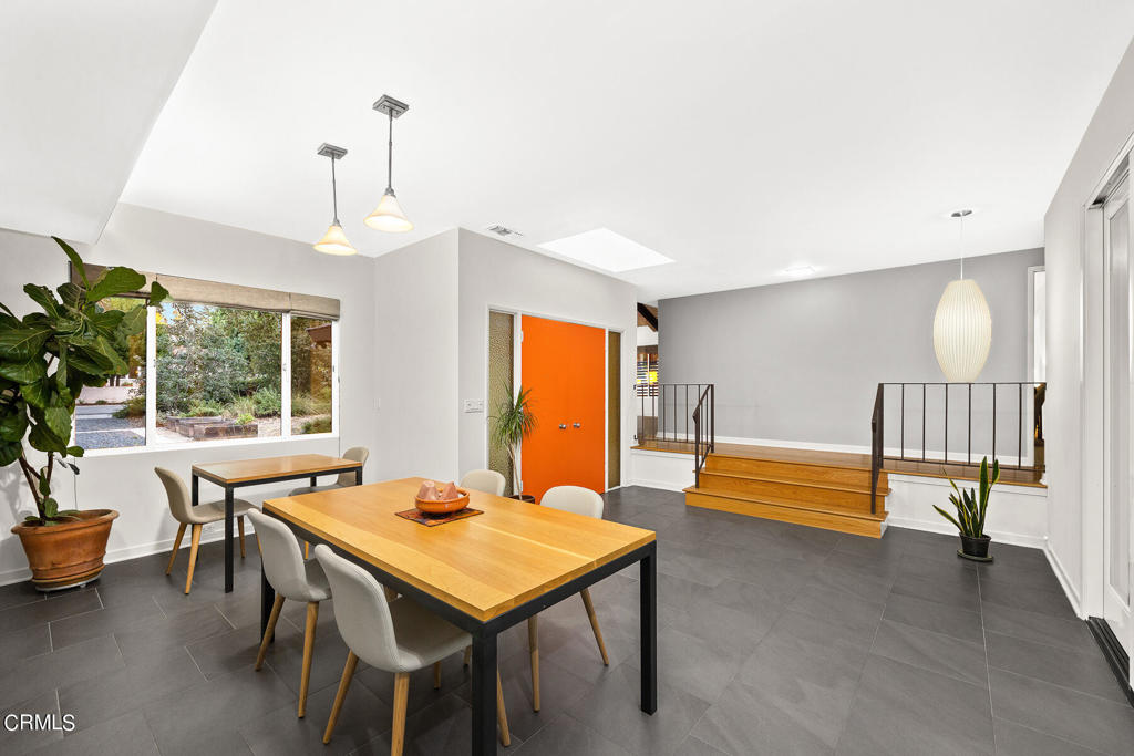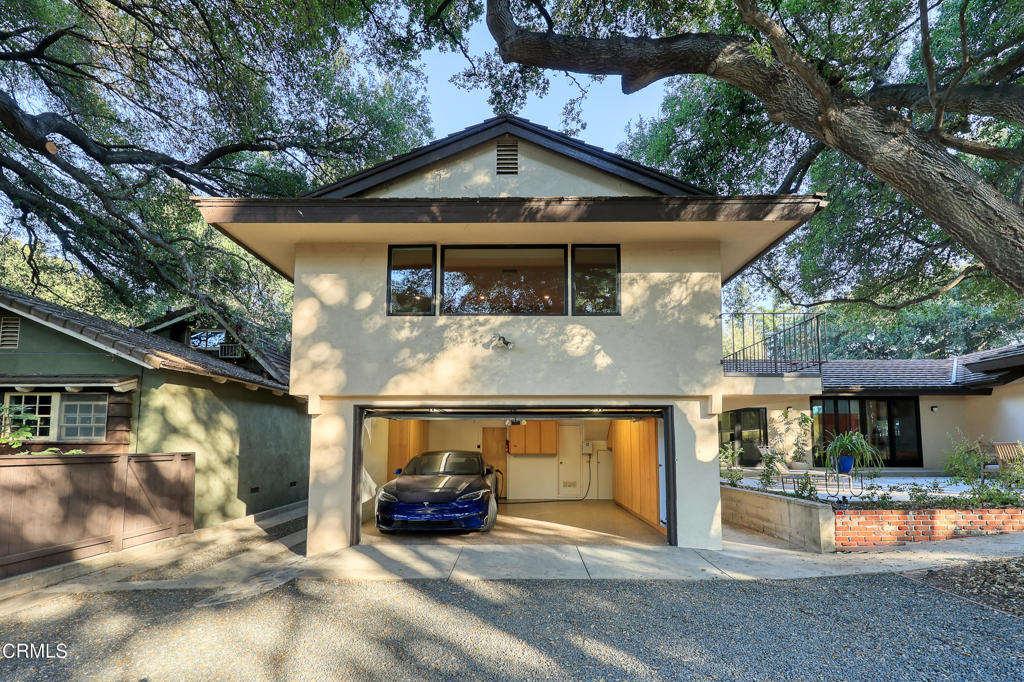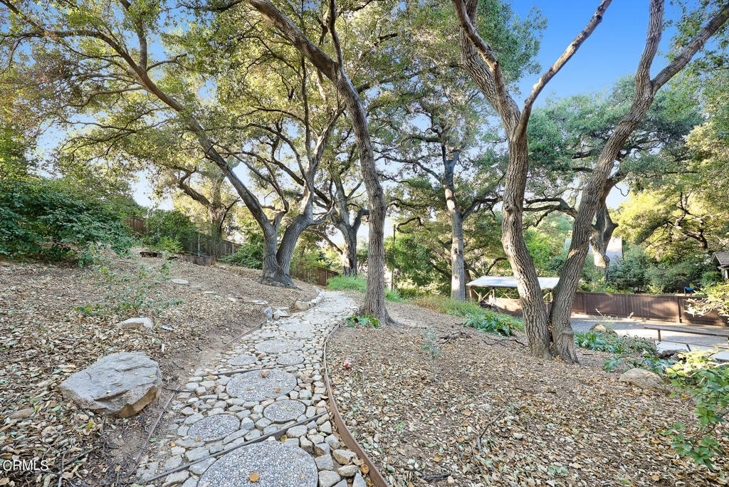 Nestled on a secluded private drive, this mid-century inspired home welcomes you to a blend of eco-conscious living and a peaceful and serene setting. Embrace a sustainable lifestyle as you make this fully electric home your own. Boasting an impressive 11.2-kilowatt solar panel system, an electric heat pump water heater, and a high-efficiency Trane heating and cooling system, this home not only reduces your carbon footprint but also offers significant financial savings. As you step inside, a spacious entry and dining combination welcome you with tile floors, a skylight that provides natural light, designer light fixtures, and sliding French doors with sweeping views of the backyard. The living room is a masterpiece of tranquility and features a cathedral ceiling with exposed wood beams, creating a sense of spaciousness. A floor-to-ceiling brick-faced fireplace faces abundant windows and a skylight, which shower the room with a soft, delicate glow. The primary bedroom suite boasts views of the backyard, patio, and lush greenery, inviting the beauty of the outdoors in. Recessed lighting, oversized closets with mirrored doors, and built-in shelves provide ample storage and convenience. The spacious bathroom features double sinks and abundant cabinetry for your daily needs. The junior bedroom suite is both spacious and stylish with an oversized closet and an adjoining full bath; it's the perfect retreat for family or guests. The heart of this home, the kitchen, offers a modern culinary experience featuring granite counters, an island with an induction cooktop, double ovens, a breakfast area, glass-faced cabinets, porcelain floor tiles, and ample storage that make it a chef's dream. The possibilities are endless with a multi-purpose room that includes a granite counter and sink, wine fridge, and direct access to the garage. Whether you need a home office, gym, or recreational room, this space adapts to your lifestyle. Additional features include a spacious den, two additional bedrooms with shared hall bath, an attached two-car garage with newly resurfaced epoxy floors and an EV charger, solid oak wood floors, and connection to the public sewer system (bond paid). The park-like setting offers an oasis of greenery, featuring a looping path shaded by multiple oak trees, a fire pit deck, and a courtyard accessible from most living spaces. It's a serene escape from the outside world, yet located minutes away from the YMCA, Town Center, and local freeways.